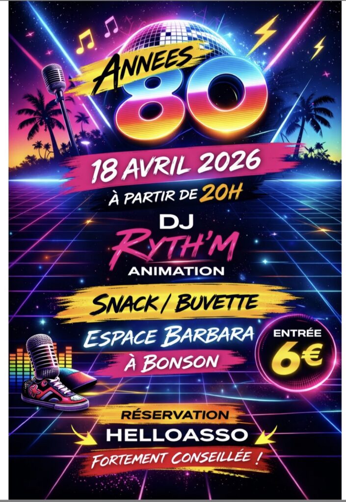 - Samedi 18 avril 2026 : soirée disco 80, Bonson (42)